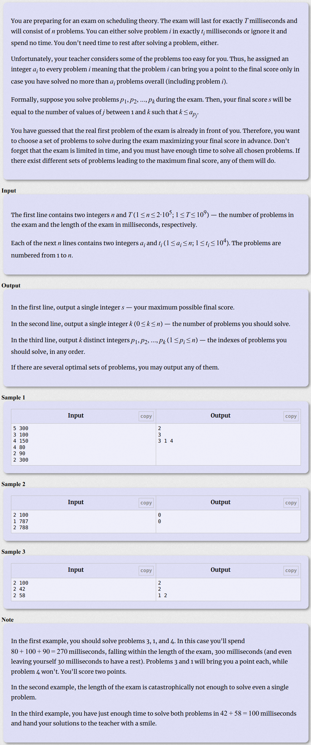 Obviously, the function of solving time and the number of problems solved is monotonic. Use binary search to find the number of problems solved. $O(n\log^2)$